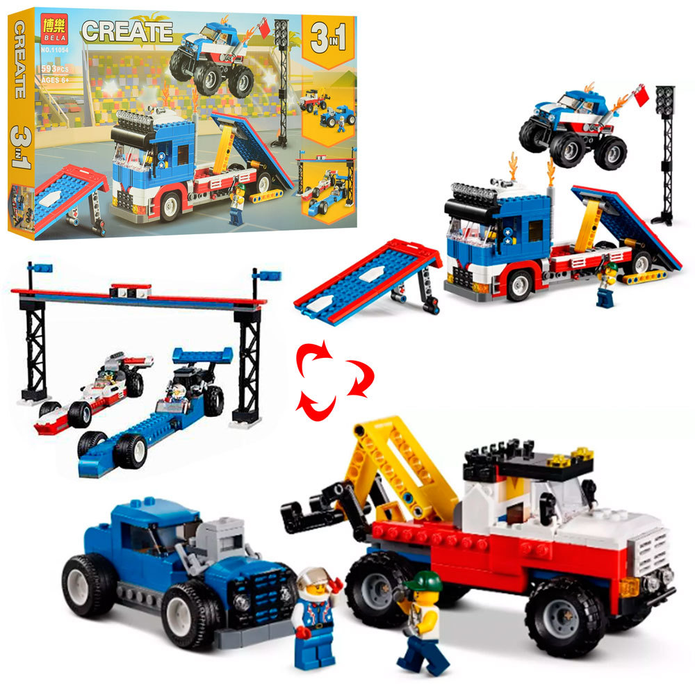 Запрыгивай на борт крутого транспортера и отправляйся в город вместе с удивительным набором «Мобильное шоу» Creator 3 в 1! Сними монстрогрузовик с транспортера, настрой прожектор и установи трамплины для прыжков и приземлений. Lepin.by. Затем используй противооткатные упоры, чтобы заблокировать транспортер, и приготовься развлекать зрителей! Заведи монстрогрузовик, прыгни с трамплина на максимальной скорости, пролети по воздуху и соверши идеальное приземление! Затем перестрой набор, чтобы продолжить шоу с мощным пикапом в стиле хотрод или двумя супербыстрыми драгстерами.